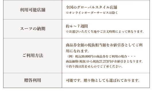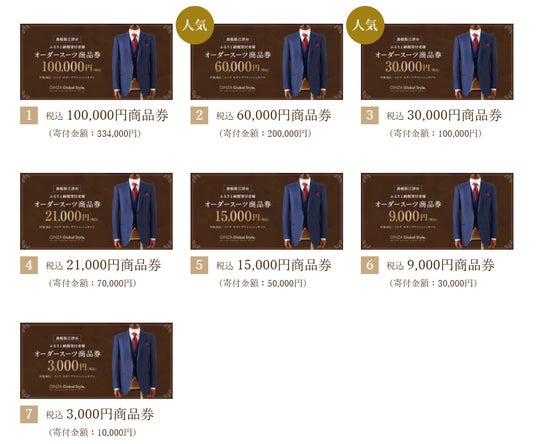 返礼品には、鳥取県(鳥取市)のグッドヒル社、愛知県(豊橋市)のアルデックス社、島根県(江津市)のトップソーイング社との共同企画で、全国のグローバルスタイルでご利用いただける「商品券」をご用意しております。