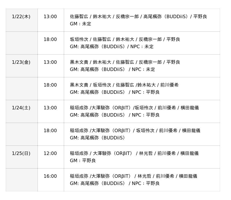 プレイヤー出演は大澤駿弥(ORβIT)、坂垣怜次、佐藤智広、平野良、横田龍儀。(出演者は50音順)