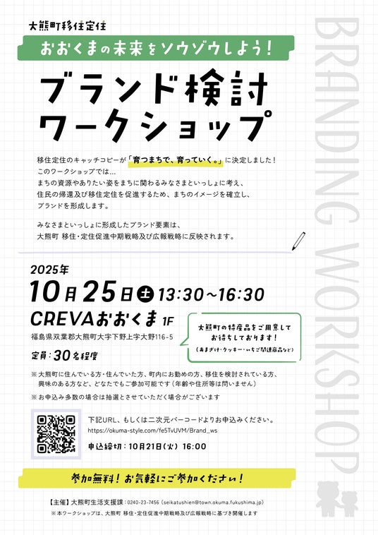 福島県大熊町(町長:吉田 淳)生活支援課では、移住定住広報事業の一環として、まちの資源やありたい姿をまちに関わる方と一緒に考え、住民の帰還及び移住定住を促進し、まちのイメージを確立し、ブランドを形成するため、「大熊町移住定住ブランド検討ワークショップ」を10月25日(土)に大熊町産業交流施設CREVAおおくま(〒979-1308 福島県双葉郡大熊町大字下野上字大野116-5)で開催します。