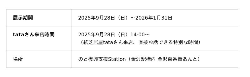 2025年9月28日(日)から「のと復興支援Station(金沢百番街あんと内)」では、紙芝居屋tataさんが制作した応援メッセージの展示が始まります。展示初日には、tataさん が来場し、来場者と直接交流できる特別な時間を予定しています。