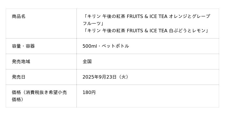 キリンビバレッジ株式会社(社長 井上一弘)は、紅茶飲料売上本数No.1ブランド※1「キリン 午後の紅茶」から、「キリン 午後の紅茶 FRUITS & ICE TEA オレンジとグレープフルーツ/白ぶどうとレモン」の2品を、2025年9月23日(火)より新発売します。