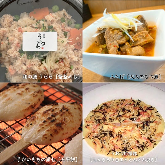 古くから「漁師飯」として親しまれるバイ貝を使った炊き込みご飯「魚津バイ飯」や、日本海の深海魚「幻魚(ゲンゲ)」使った「ゲンゲ唐揚げ」、地元の魚で作ったすり身と玉葱をパンにはさんであげた「魚津ハトシ」をはじめ、「ます寿司」や「海鮮丼」、富山湾の宝石「白エビ」を使った「どんどん焼き」など、魚津の地元飯を提供します。魚津商工会議所青年部が企画したクラフトビール「UOZU IPA」の販売も予定しています。