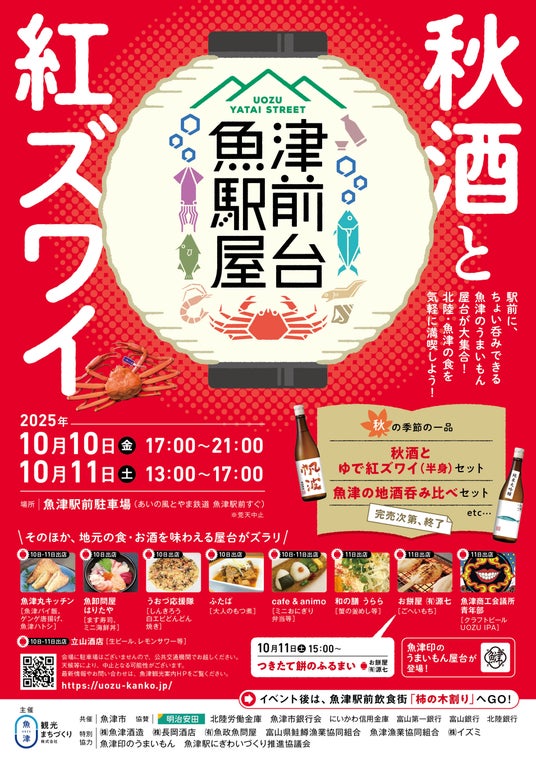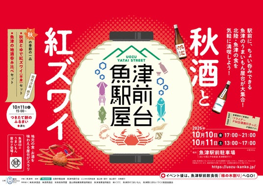 魚津観光まちづくり株式会社(富山県魚津市釈迦堂1丁目13-11、代表取締役 四十万隆一)は2025年10月10日(金)と11日(土)の2日間、魚津産の紅ズワイガニと地酒を気軽に満喫できる屋台イベント「魚津駅前屋台~秋酒と紅ズワイ~」(魚津市共催)を、あいの風とやま鉄道の魚津駅前で初開催します。