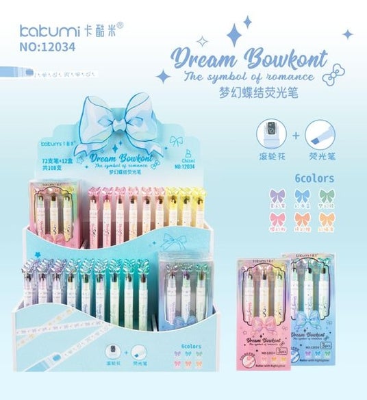 平成女児カルチャーを思わせる、ポップでキュートなデザインが魅力のリボンキャップ型ローラーハイライターマーカー。ころんとしたフォルムに、リボンモチーフのキャップが"平成っぽかわいい"を演出。ローラー式でなめらかな書き心地と、カラフルなインクがノートや手帳を華やかに彩ります。