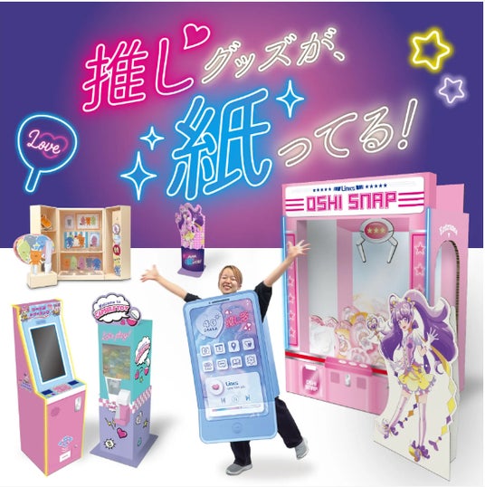 "ガラケー"をモチーフとした等身大携帯ケースや、ちょっぴり懐かしいゲーム機風『モニター付 紙製ディスプレイ』など、紙で作られた推し活グッズ。平成レトロなモチーフと最先端の素材や推し活というテーマを組み合わせた他にはない注目アイテムです。
