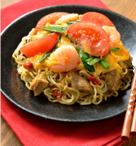 - チキンとタイカレー(グリーン)で作る「えびニラ玉麺」