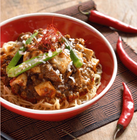 - チキンとインドカレー(黒カレー)で作る「辛ウマ麻婆カレー麺」