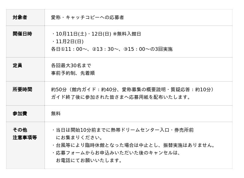 この節目の年を機に、これまで以上に皆さまに愛され、親しまれる施設となるよう、熱帯ドリームセンターの「愛称」と「キャッチコピー」を一般公募いたします。皆さまの想いが、新たなシンボルとなります。たくさんのご応募をお待ちしております。