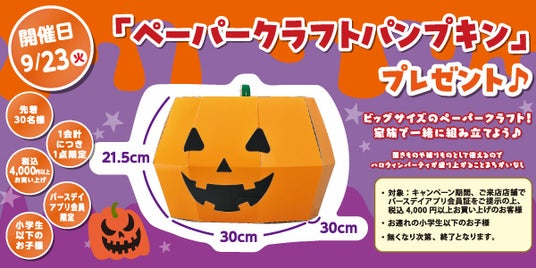 セール期間中、店内商品を税込4,000円以上お買い上げいただいた先着30名様に、バースデイオリジナルのペーパークラフトパンプキンをプレゼントします。