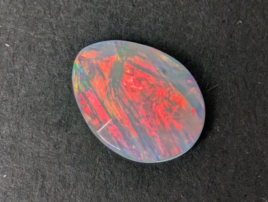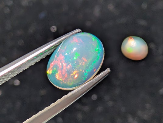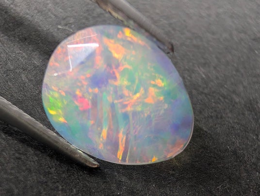 オパールは、乳白色を基盤の色とし、その中で虹色の光が浮かび上がる宝石です。この現象は「遊色効果(ゆうしょくこうか、英語ではプレイオブカラー)」と呼ばれ、光の当たる角度によって多彩な色彩が変化します。東洋ルースにおいても、オパールは毎展示会の売上ランキングで常に上位3位以内に入る、人気宝石です。