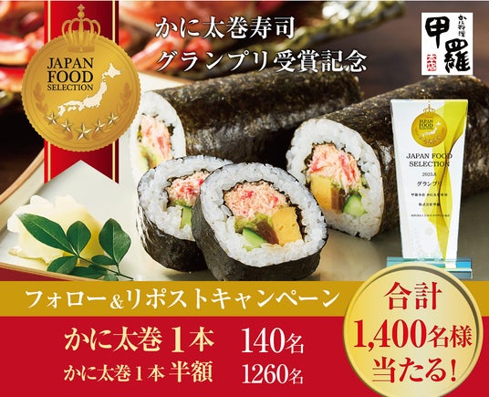 株式会社甲羅(本社:愛知県豊橋市、代表取締役社長:沼澤 裕)が運営する、かに料理専門店「甲羅本店」の「かに太巻寿司」がジャパン・フード・セレクションでグランプリを受賞したのを記念して、公式Xにてキャンペーンを9月23日(火)より開催。抽選で140名に「かに太巻寿司1本無料」、さらに1,260名に「かに太巻寿司1本半額」となる大盤振る舞いのキャンペーンを実施。まだ、甲羅本店「かに太巻寿司」を食べたことのない方は、この機会をお見逃しなく!