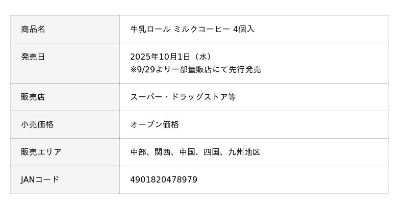 敷島製パン株式会社(Pasco)は、株式会社明治の「明治おいしいミルクコーヒー」を使用した「牛乳ロール ミルクコーヒー 4個入」を、2025年10月1日(水)※から中部、関西、中国、四国、九州地区にて発売します。