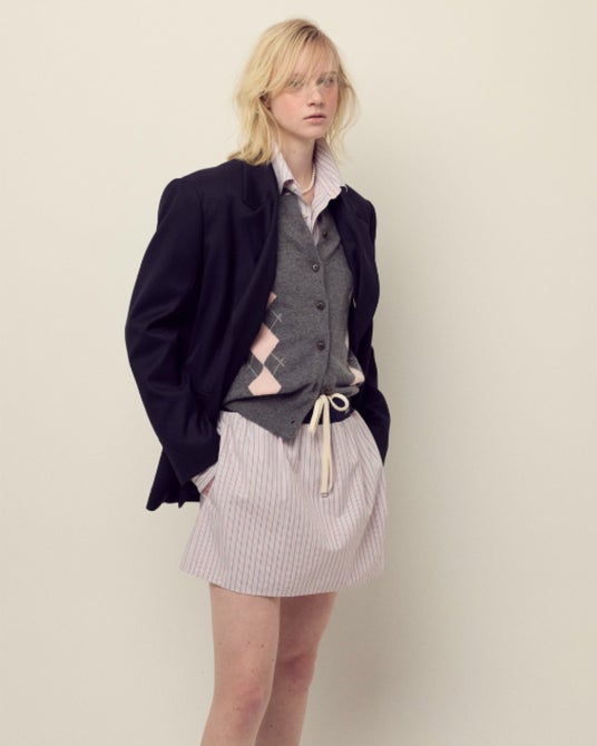 CASHMERE BLENDED CARDIGAN ROUND NECK ARGYLE / ¥22,550 COTTON SHIRT STRIPE / ¥16,500 COTTON MINI SKIRT STRIPE CONTRAST WAISTBAND / ¥16,500