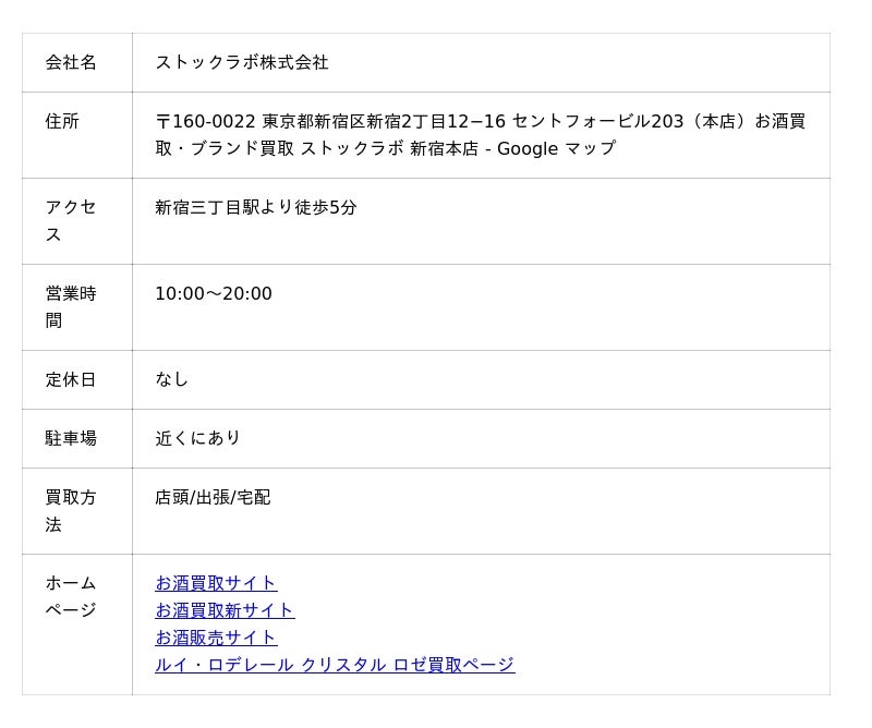お酒買取専門店ストックラボのルイ・ロデレール クリスタル ロゼ買取の特徴を3つに分けて解説します。まずは、ストックラボの業者の概要をご確認ください。