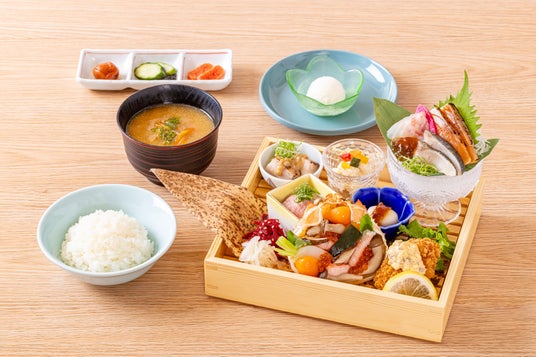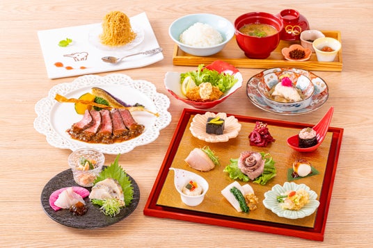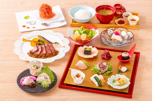前菜9種ちょっと盛りをはじめ、3種の刺身、牡蠣フライ、ぶりの南蛮漬けに、黒毛和牛のステーキなど、華やかで贅沢な料理をご用意しました。人気のデザートについては、季節に合わせて秋は栗味の、冬はいちご味のモンブランケーキをご提供します。ふんわりとしたスポンジケーキと、粒感がくせになるお米アイス、なめらかなモンブランクリームの絶妙な調和をご堪能ください。