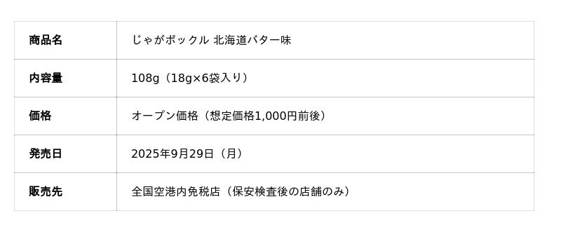 カルビー株式会社(本社:東京都千代田区、代表取締役社長兼CEO:江原 信)は、北海道土産のロングセラー商品「じゃがポックル」より、新しいフレーバー『じゃがポックル 北海道バター味』を2025年9月29日(月)から全国の国際空港内の免税店(保安検査後の店舗のみ)で発売いたします。国際空港限定の商品の発売は、カルビー史上初めてです。