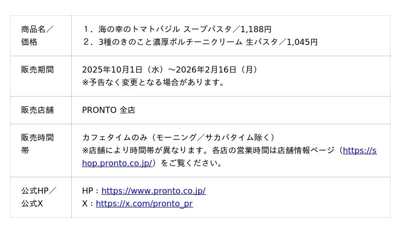 株式会社プロントコーポレーション(本社:東京都港区、代表取締役社長:杉山和弘)は、飲食チェーン『PRONTO(プロント)』のカフェタイム(モーニング/サカバタイム除く)にて「海の幸のトマトバジル スープパスタ」と「3種のきのこと濃厚ポルチーニクリーム 生パスタ」を、2025年10月1日(水)より発売します。