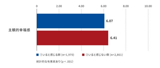 - 「静かな退職者」は周囲に影響をもたらすのでしょうか。必要最低限の業務を遂行していれば大きな影響はないとも考えられますが、本調査の結果は異なりました。「自分の同僚や上司に『静かな退職』をしている人がいる」人とそうでない人の心理状態を、「主観的幸福感」*(「非常に幸福」を10点、「非常に不幸」を0点として聴取)を用いて確認したところ、周囲に静かな退職者がいると感じている人は、いると感じない人に比べて統計的に有意に幸福感が低いことが確認されました。