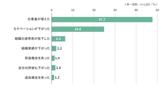 図表5:(「自分の同僚や上司に『静かな退職』をしている人がいる」に「あてはまる」「どちらかといえばあてはまる」と回答した人のみ)「自分の同僚や上司に「静かな退職」をしている人がいることで生じた不利益はありましたか。以下からひとつカテゴリーを選択したうえで、具体的に教えてください。」の回答結果 ※未回答については図表から割愛