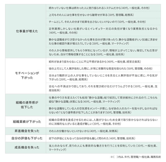- また、他の自由記述回答からは「静かな退職者を部下にもつ上司としての負担」「静かな退職者を上司にもつ部下としての負担」の双方が挙げられました。特に上司としての不利益が目立っており、「静かな退職」による不利益が管理職や管理職候補者の不足の一因となっている可能性も示唆されました。
