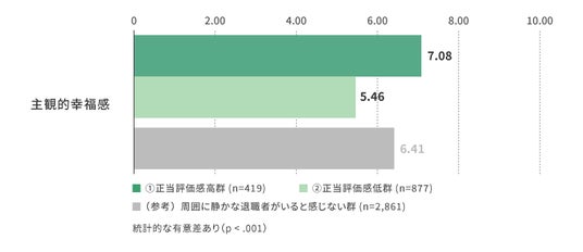 - 第2の条件は「正当評価感」です。周囲に静かな退職者がいると回答した人のうち、「会社は、従業員を正当に評価している」という実感が高い人(「あてはまる」「どちらかといえばあてはまる」)を選択した人。以下、「正当評価感高群」)は、そうでない人(「あてはまらない」「どちらかといえばあてはまらない」を選択した人。以下、「正当評価感低群」)と比べて主観的幸福感が有意に高く、その差分は1.62でした。さらに、「周囲に静かな退職者がいるが、正当に評価されている実感がある」人は、「周囲に静かな退職者がいない」人よりも幸福感が高く、その差分は0.67でした。