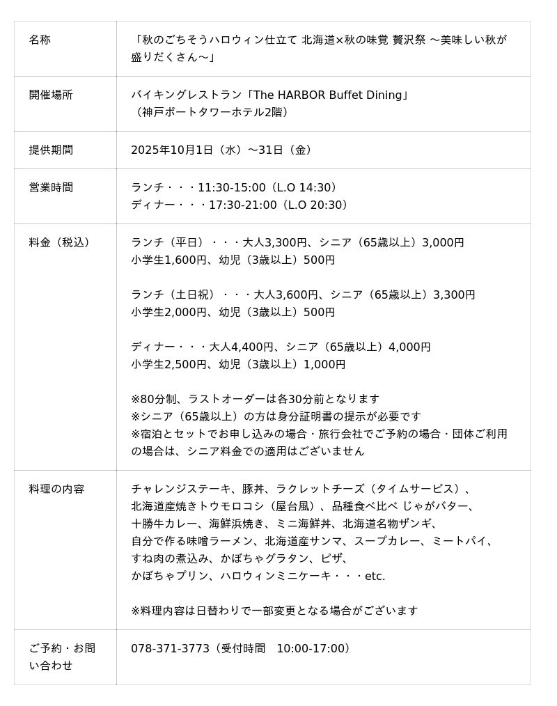 株式会社アベストコーポレーション(代表取締役:松山 みさお)が運営する神戸ポートタワーホテル(兵庫県神戸市中央区)は、バイキングレストラン「The HARBOR Buffet Dining(ザ・ハーバー ビュッフェダイニング)」で2025年10月1日(水)から31日(金)まで、「秋のごちそうハロウィン仕立て 北海道×秋の味覚 贅沢祭 ~美味しい秋が盛りだくさん~」を開催します。9月に開催し好評だった「北海道フェア」の開催を延長し、さらに「ハロウィンメニュー」と「チャレンジステーキ」を加え、パワーアップした豪華バイキングを3,000円※(税込)~ご提供いたします。