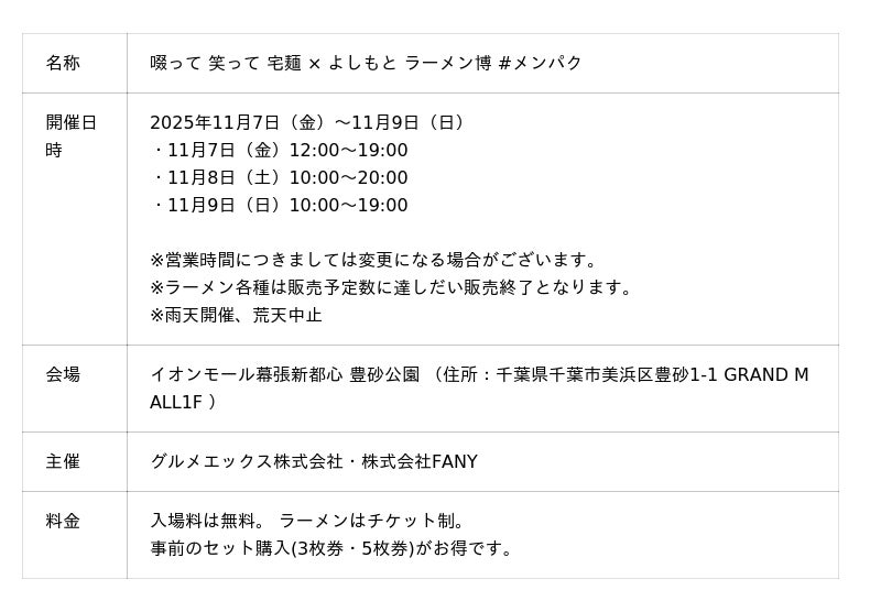 国内最大級のラーメン専門通販サイト「宅麺.com」を運営するグルメエックス株式会社(本社:東京都港区、代表取締役社長:冨澤 文秀)は、吉本興業グループの株式会社FANY(本社:東京都新宿区、代表取締役社長:梁 弘一)と共同で、11月7日(金)よりラーメンイベント「啜って 笑って 宅麺 × よしもと ラーメン博 #メンパク」を開催します。日本が世界に誇るトップコンテンツの「ラーメン」と「お笑い」がタッグを組んだ、おいしくて笑える3日間です。