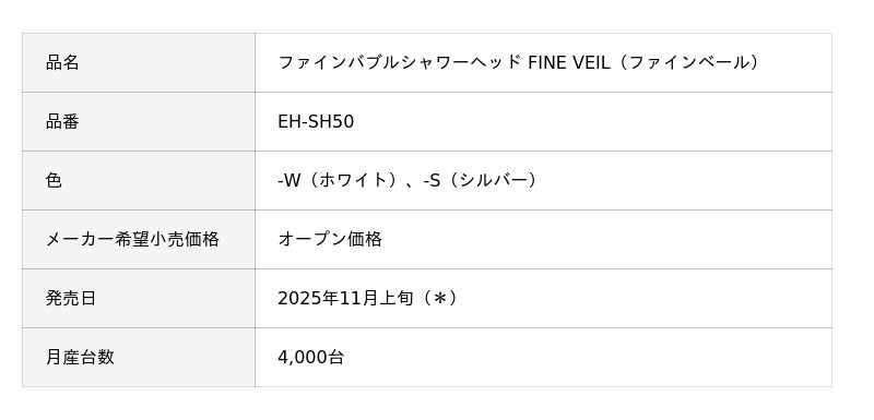 ▼[プレスリリース]ファインバブルシャワーヘッド「FINE VEIL(ファインベール)」EH-SH50を発売(2025年9月24日)