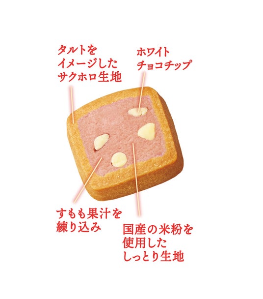 ・山梨県産すもも果汁と国産米粉、ホワイトチョコチップを練り込んだしっとり生地に、香ばしいサクホロ生地を組み合わせたソフトクッキー