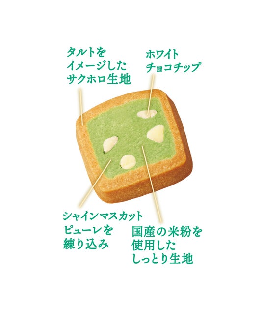 ・山梨県産シャインマスカットピューレと国産米粉、ホワイトチョコチップを練り込んだしっとり生地に、香ばしいサクホロ生地を組み合わせたソフトクッキー