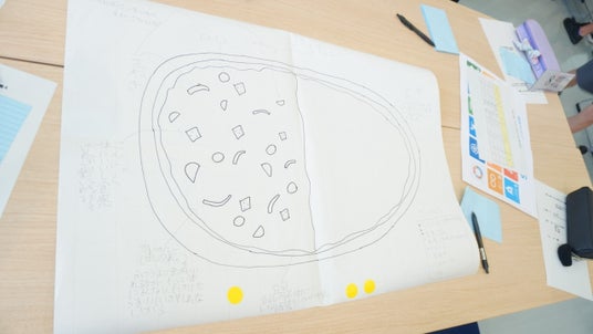 授業の冒頭は、SDGsを"自分ごと"にするためのワークショップからスタート。5年後に迫ったSDGsの目標達成期限を前に、「将来、自分たちが大人になったとき、未来の子どもたちに何を残したいか」をテーマに話し合いました。