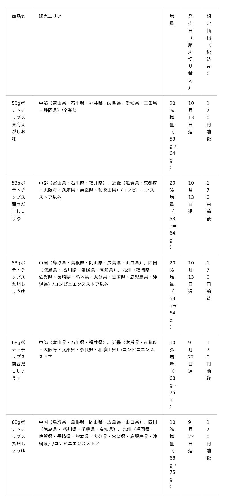 ※コンビニエンスストアでは9月22日週より「うすしお味」「のりしお」「コンソメWパンチ」を 10%増量(うすしお味、のりしお:70g⇒77g、コンソメWパンチ:61g⇒68g)します。