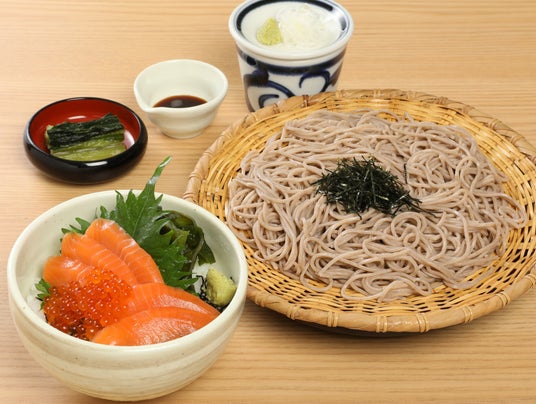 サーモンいくら丼定食さっぱりサーモンと、ぷちぷちとしたいくらの食感が楽しい海鮮親子丼です。秋らしい彩りの丼をおそばと共にお楽しみください。