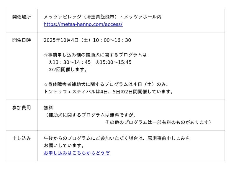 特定非営利活動法人日本補助犬情報センター(神奈川県横浜市、理事長:吉田文)は、NPO法人ディーセントワーク・ラボの協力のもと、身体障害者補助犬啓発イベント【盲導犬・介助犬・聴導犬を知ろう!@トントゥフェス】を2025年10月4日(土)に開催します。
