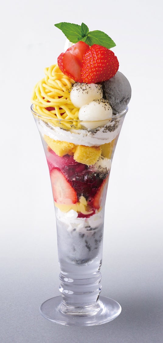 特長:香ばしくコクのある黒ごまと相性のよいモンブランクリーム、カシスのソルベ、あんこ、白玉などを盛り合わせた和洋折衷パフェ。それぞれの食感や素材同士のマリアージュから生まれる新鮮な味わいをお楽しみください。