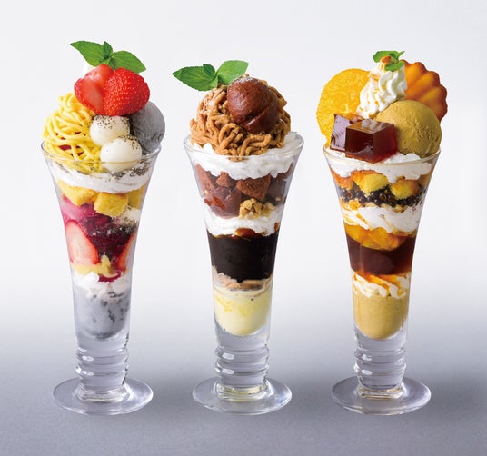 ▲(画像:左)黒ごま香る和風仕立てのパフェ (画像:中央)和栗のモンブランパフェ (画像:右)和紅茶のパフェ