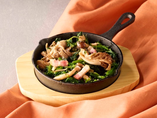 素揚げした舞茸としめじ、ほうれん草やベーコンをバターと一緒に合わせました。ほうれん草に、きのこの旨みとベーコンの程よい塩味がマッチします。追加の一皿としても、お酒のお供としてもぴったりな一品です。