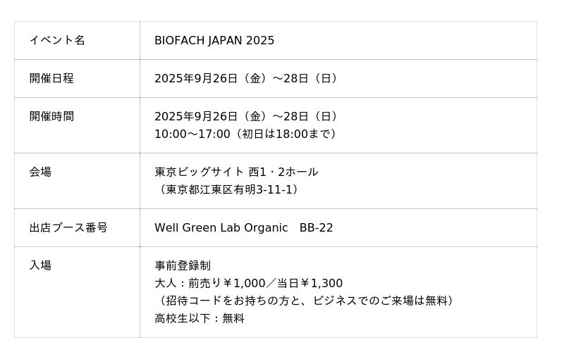 【Well Green Lab Organic】がBIOFACH JAPAN 2025に出展