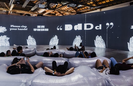 会場中央に設置されたクッションスペース。観客は寝転びながら、音と映像に包まれるようなインタラクティブ演出を体感。