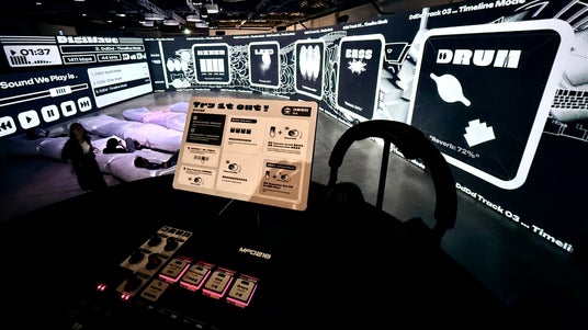 操作体験が可能な来場者向けサウンド装置。壁一面に映し出されるビジュアルと連動し、音を収集・編集する没入型体験を楽しめる。
