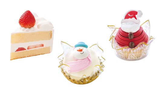 左から「クリスマスあまおう苺のショートケーキ」、「クリスマス雪だるまケーキ」、「クリスマスサンタの苺モンブラン」