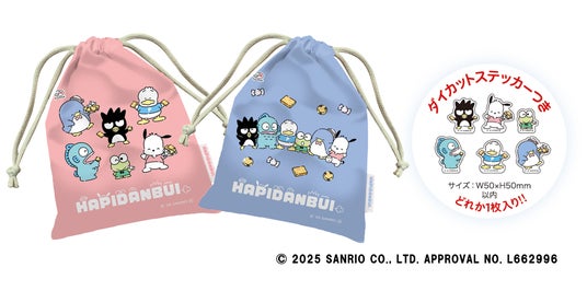 サンリオキャラクターユニット「はぴだんぶい」とコラボした特別なデザインのお菓子入り巾着です。キャラクターたちが不二家のお菓子を手に持ったデザインは可愛らしさ満載。「はぴだんぶい」のダイカットステッカー(全6種)がランダムで1枚封入されています。どのキャラクターが出るかお楽しみに!