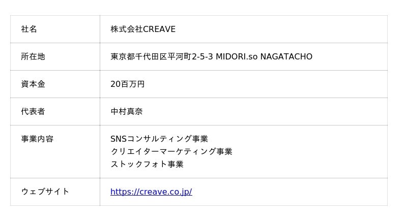 株式会社CREAVEが運営する、生活者目線での撮影・SNS発信が得意な35万人のクリエイターが集うプラットフォームです。2024年10月に登録クリエイター数が35万人を突破しました。「可能性に光を当てる。毎日にきっかけを創っていく。」というサービスミッションの元、スキルアップやクリエイター同士の交流、自己実現などのクリエイターが活躍できる機会の創出を目指しています。