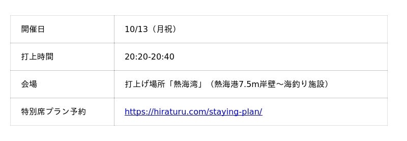 【秋空に咲く大輪の華】秋旅シーズン到来!10月の熱海海上花火大会は13日(月祝)特等席確約の送迎付きプランの販売中。空席少なくなっているので、ご予約はお早めに!