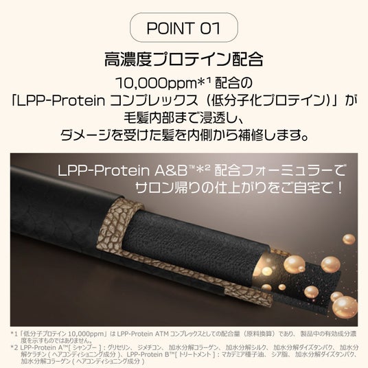 「低分子プロテイン10,000ppm*¹が髪内部に浸透し、ダメージを補修」
