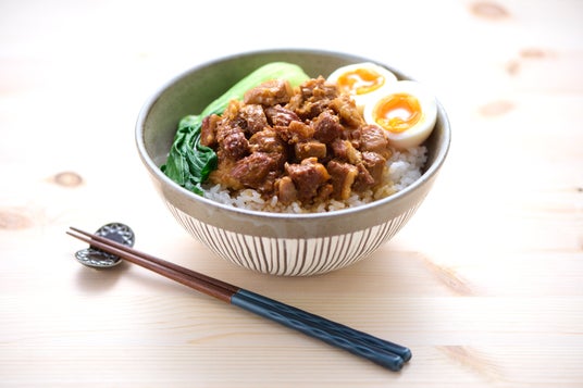 半熟卵とチンゲン菜を乗せてルーローハン風に