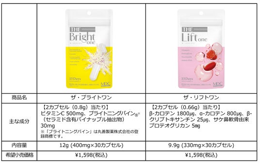 話題の成分でもっと輝く自分を目指したい。色々なケアに興味はあるけれど、とにかく安全に手軽にケアしたい。日々のお手入れはしているけれど、本当にこれだけでいいの? MDC ザ・ワンシリーズは、そんなお悩みにこたえるインナーケアシリーズです。「ザ・リフトワン」発売を記念して、既存のシリーズ品「ザ・ブライトワン」の3日分のサンプル付きの企画品を初回出荷分15,000個限定で販売します。また、「ザ・ブライトワン」も「ザ・リフトワン」の3日分のサンプル付きの企画品を5,000個限定で販売します。