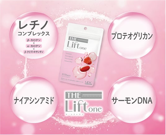 「ザ・リフトワン」は、話題の成分を配合した独自のザ・リフトワンフォーミュラが、内側からのケアを総合的にサポート。3つのプロビタミンAカロテノイドを配合した「レチノコンプレックス」、サケ鼻軟骨由来の糖たんぱく質で貴重な成分の「プロテオグリカン」、ビタミンB群の一種「ナイアシンアミド」、たんぱく質、脂質を除去しDNAを高含有させたサケ白子抽出物「サーモンDNA」をツヤめくハリ玉カプセルに独自配合。