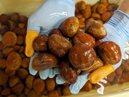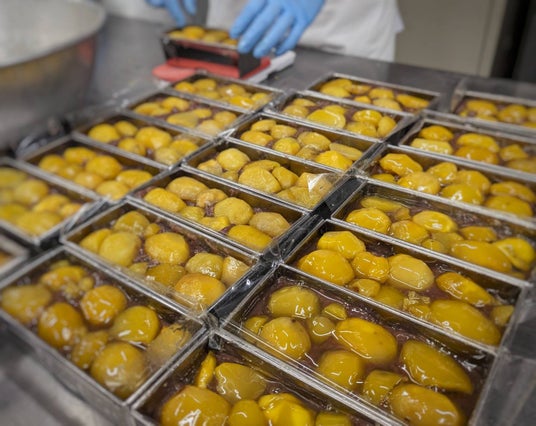 収穫されたばかりの新鮮な栗を、産地から直送ですぐに受け取り、専用の皮むき機で素早く処理 → 独自の蜜漬け製法で仕上げます。