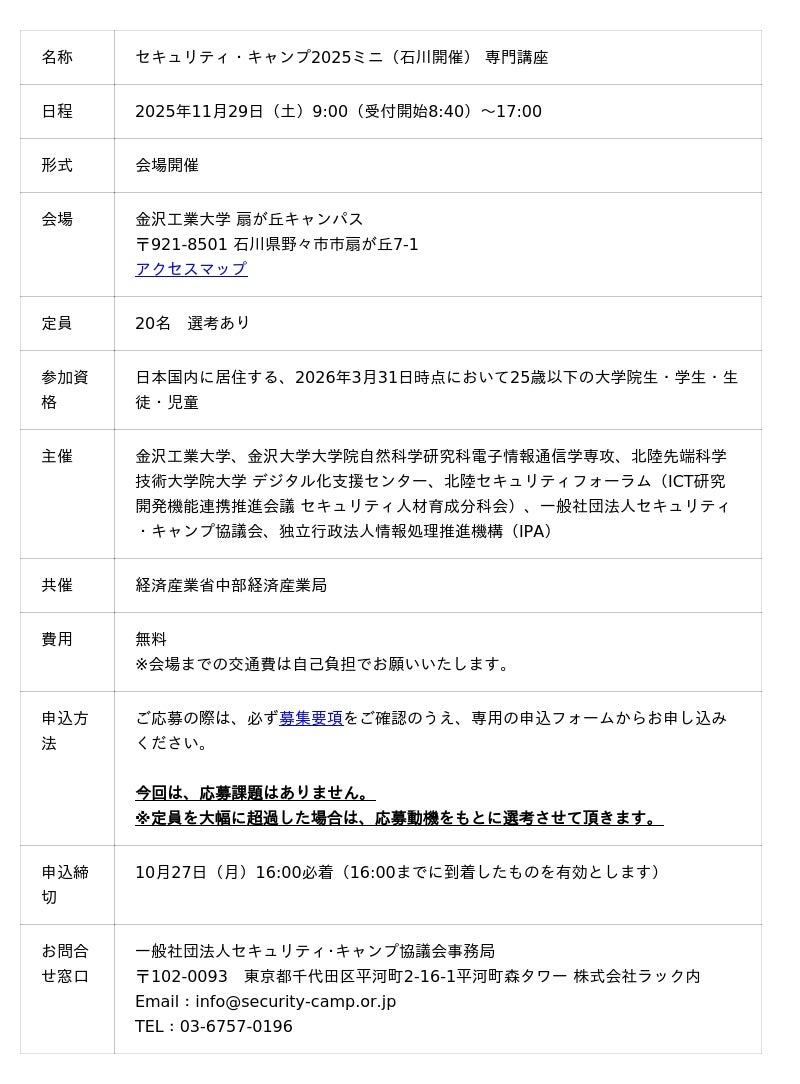 イベント詳細:https://www.security-camp.or.jp/minicamp/ishikawa2025.html